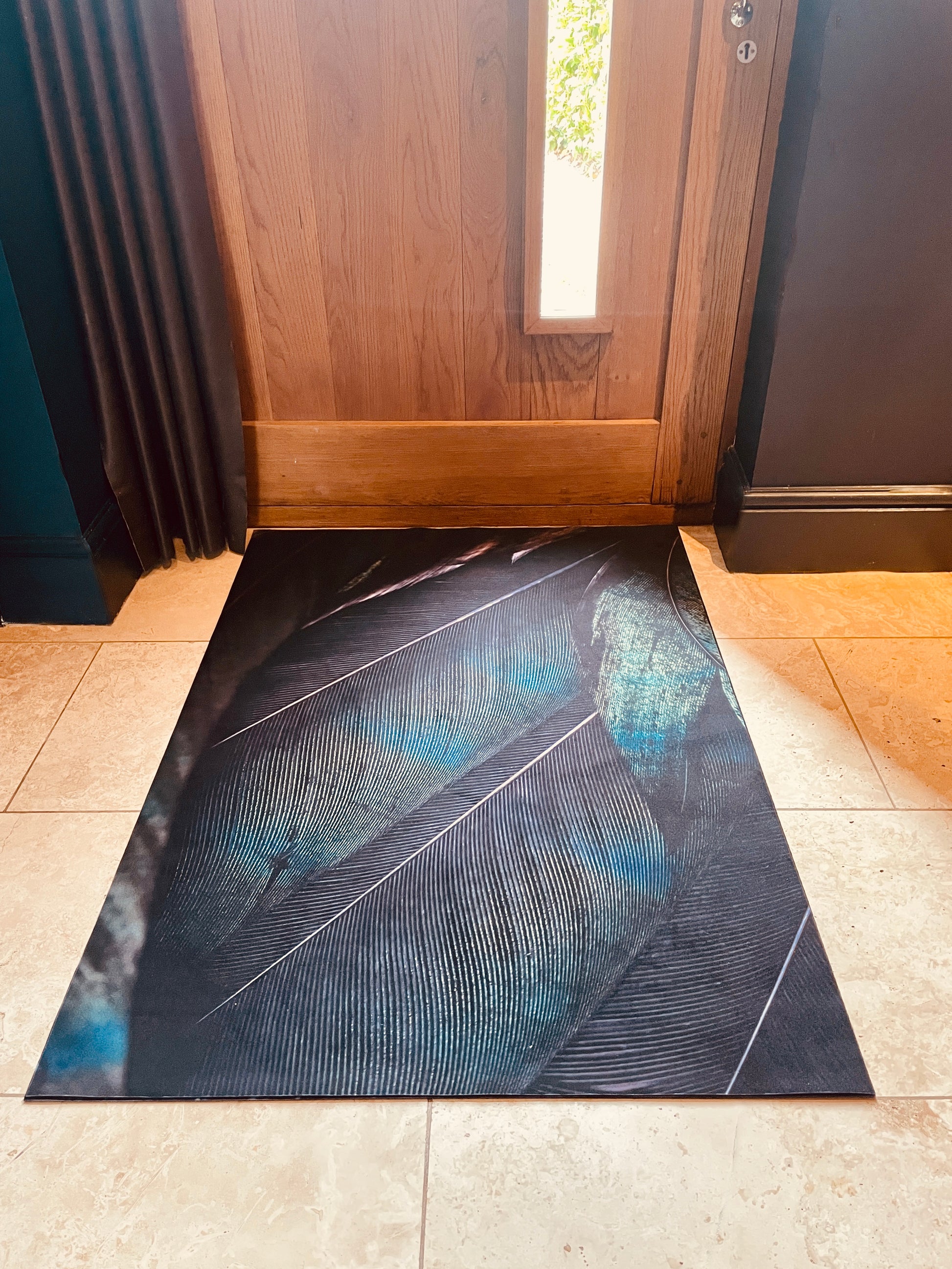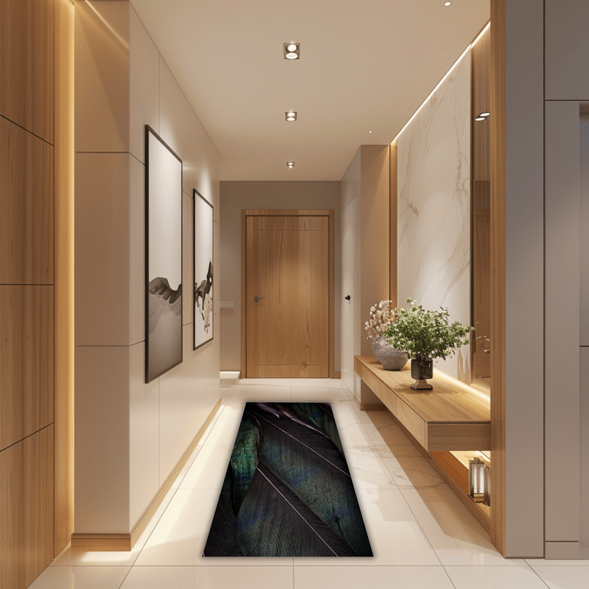 The beautiful iridescent green feather floor mat adds a subtle yet captivating touch to contemporary hallways. Β It features a delicate pattern that brings a sense of lightness and natural elegance to modern interiors. Crafted from durable materials, this mat not only enhances the visual appeal of your space but also provides reliable protection against everyday wear, making it a practical and stylish addition to your home.